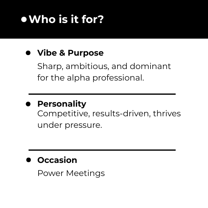 BASE:Ā šŖµ Sandalwood Suede,Ā AmbergrisĀ š,Ā Dark Vanilla BeanĀ š“ āĀ A trail of success that lingers in the boardroom.